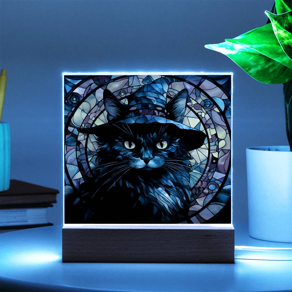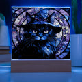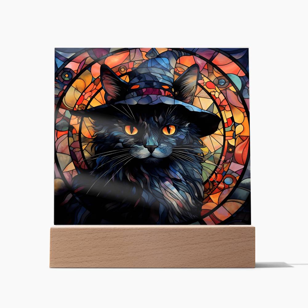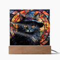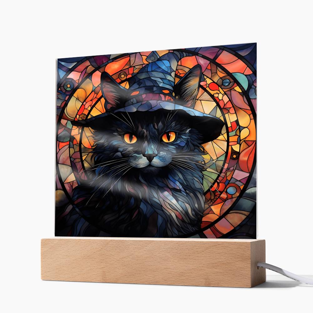3D Lifelike Vibrant Halloween Painting of a Black Cat Wearing a Witch Hat in a Stained Glass Window on Acrylic Deco with LED Lights