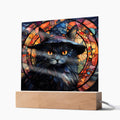 3D Lifelike Vibrant Halloween Painting of Black Cat Wearing a Witch Hat in a Stained Glass Window on Acrylic Deco with LED Lights