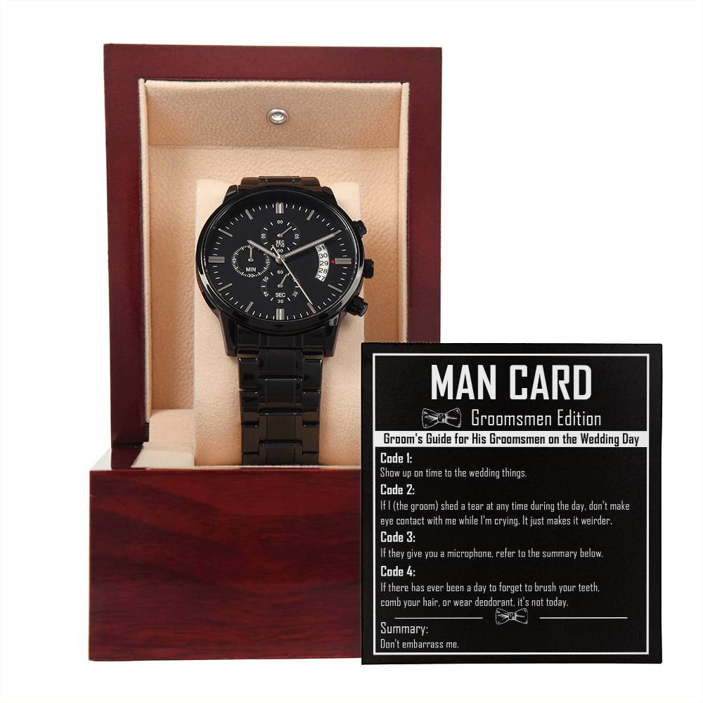 A handsome gift that can withstand constant use, this Black Chronograph Watch is perfect for all the special men in your life. A thoughtful present to your groomsmen, an anniversary memento, or a long-lasting keepsake for Father’s Day - it's a versatile piece sure to warm hearts and create smiles. Featuring a three-dial face, calendar function, and luxury pointer in a water-resistant and scratch-proof vessel.